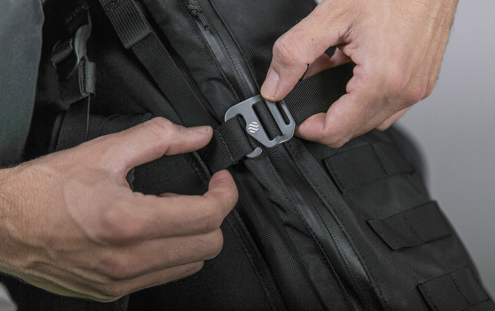 Just like the Daypack, the Rucksack is made of high quality materials. Everything is built tough and solid and with quality workmanship. A zipper divides the main compartment from a bottom compartment and can be opened to merge the whole into one large compartment. In the top of the Rcuksack, there are two smaller pockets, one with a built-in keyring. Inside the main compartment there is also a padded laptop sleeve, which can also be reached via a side zipper. Alternatively, the laptop compartment could be used for a small hydration system and the side zipper for the drinking tube. The Rucksack is secured with two G-Hooks on the front.